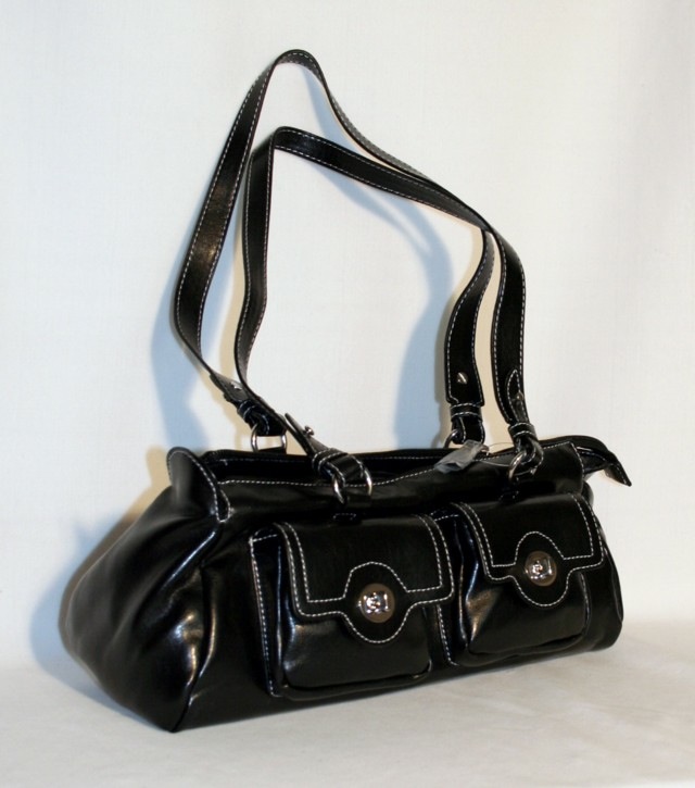 Dámská syntetická kabelka z měkké kůže menší velikosti.Kabelka má 2 delší ucha,díky kterým ji můžete nosit v dlani ,nebo na rameni.Na přední straně jsou 2 kapsičky na zavírání. Kabelka má ozdobné prošití kontrastní nití. Zapíná se na zip. Uvnitř jedna separace s kapsičkou na mobil a zipovou kapsičkou.